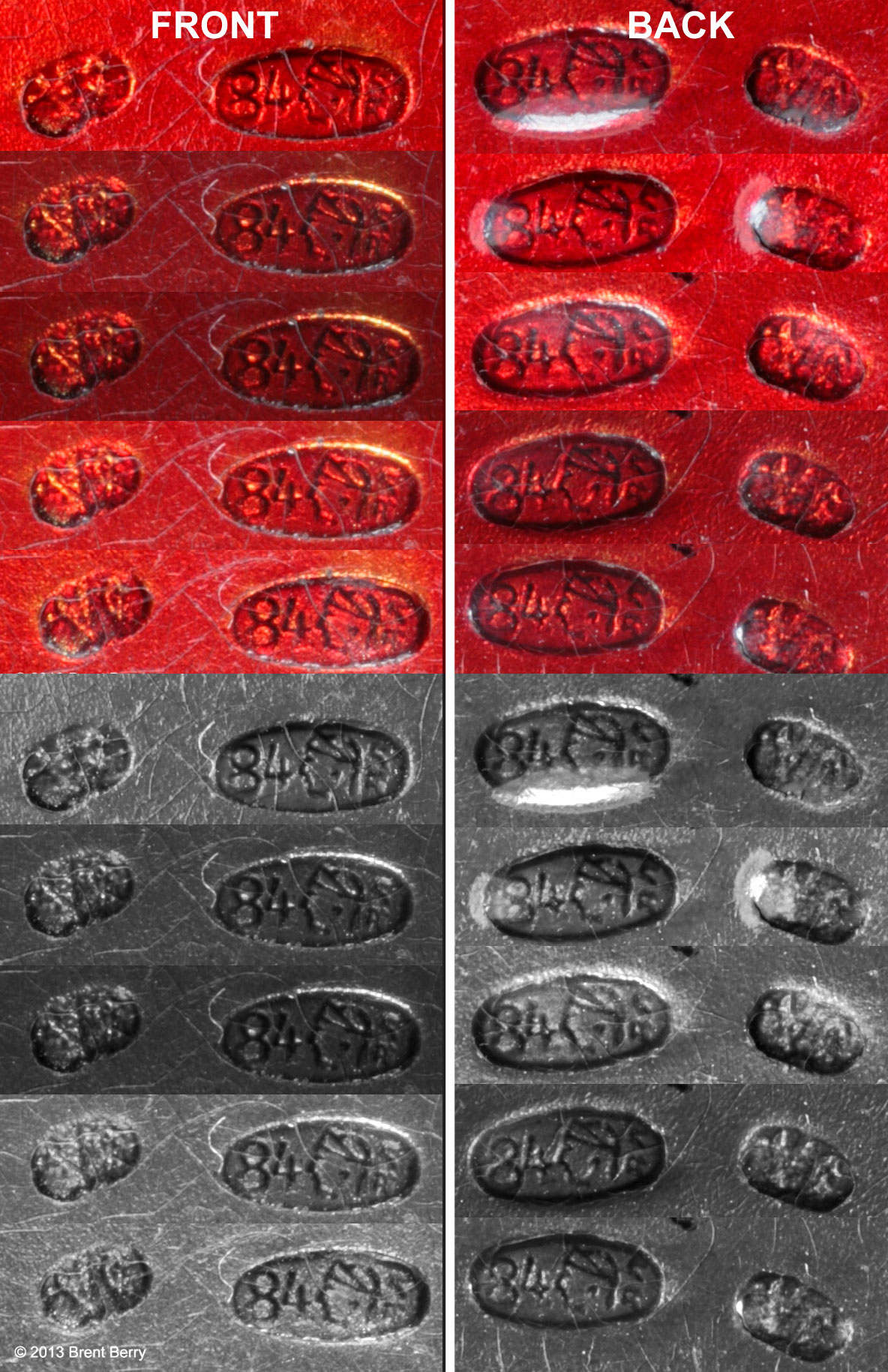 Photos of the 2 sets of Faberge marks, taken with the lighting from various directions.
